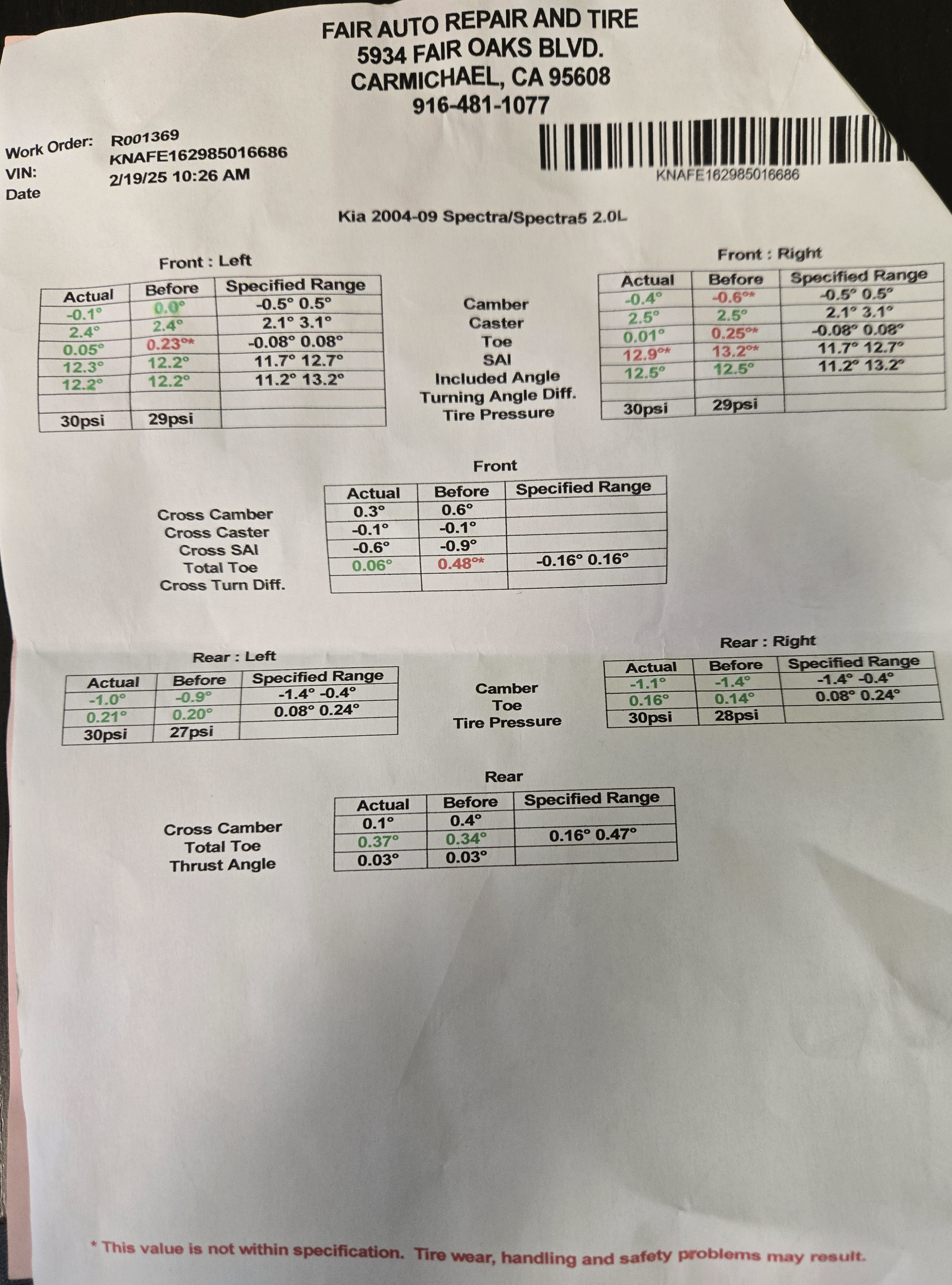 - Front toe was notably out, not unexpected with two tie rod ends being changed and no alignment.