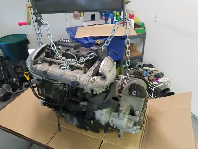 - Discovered a missing timing cover bolt that was supposed to be covered by the idler pulley. Had an M8x20mm in my spares, so crisis averted. Book says to replace the small seal under the center timing cover bolt. Couldn’t source it from Mini dealer in a timely fashion, and it wasn’t leaking and was in good condition, so cleaned it up.