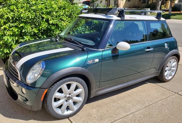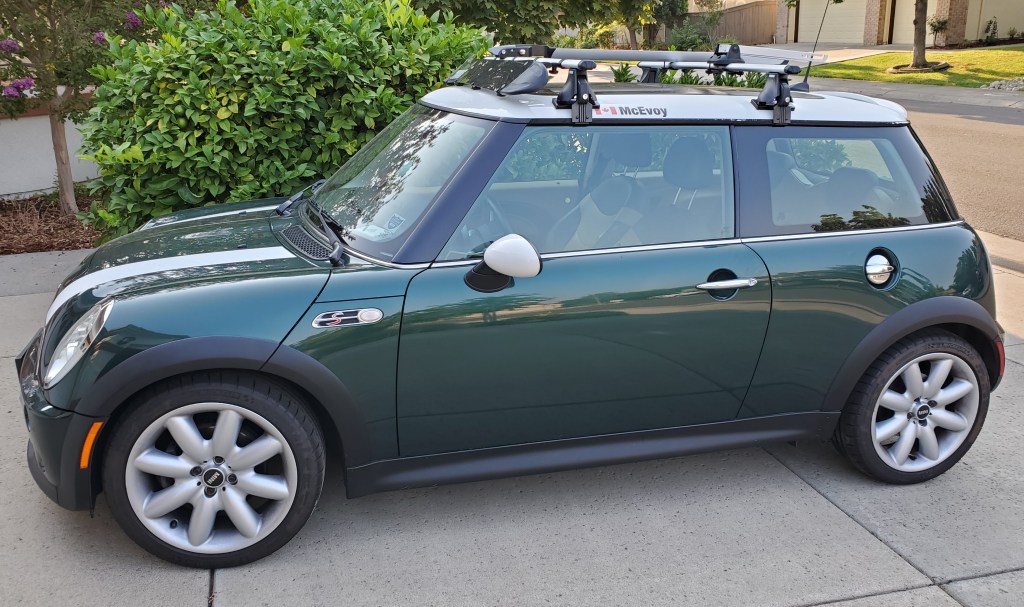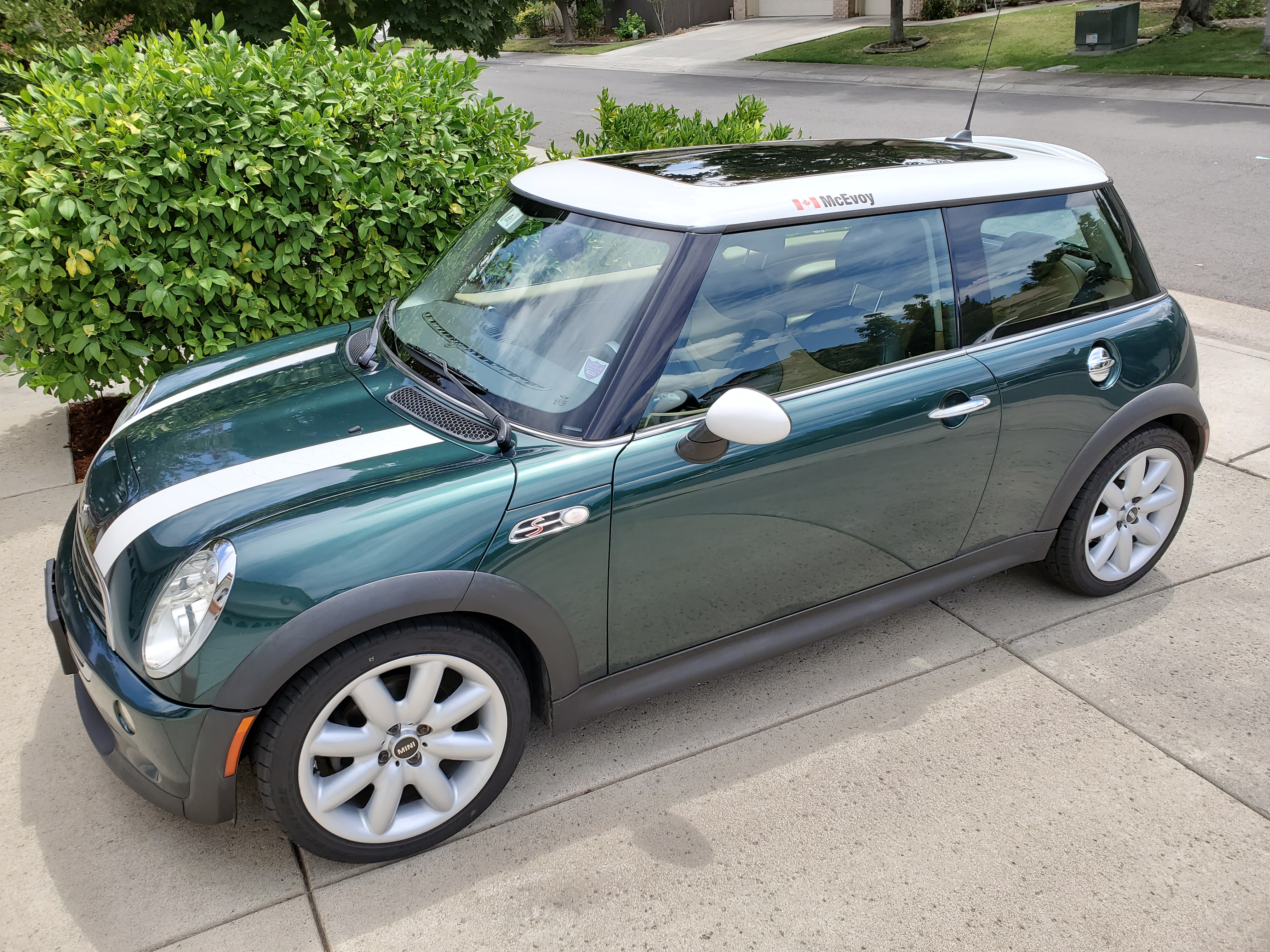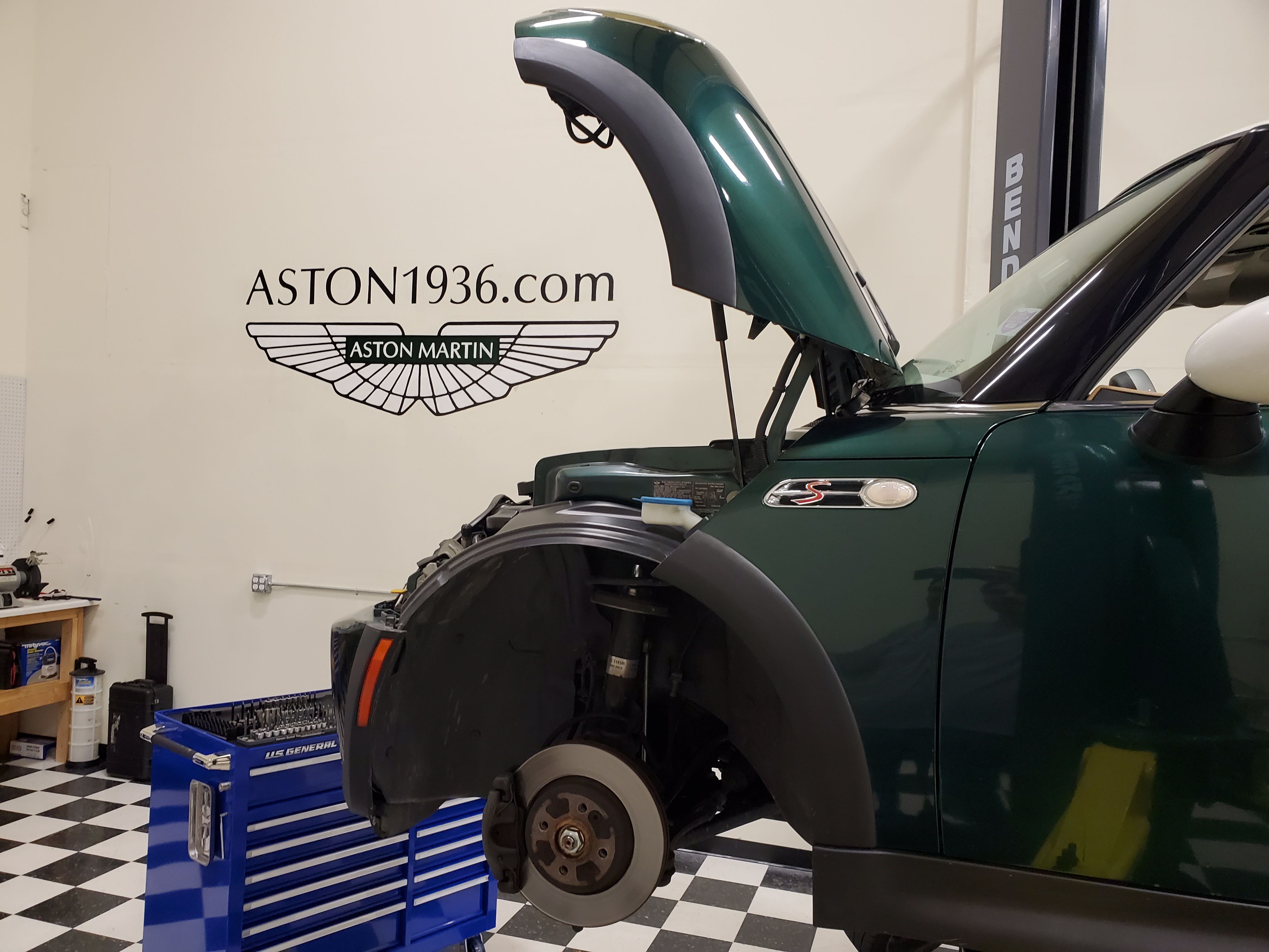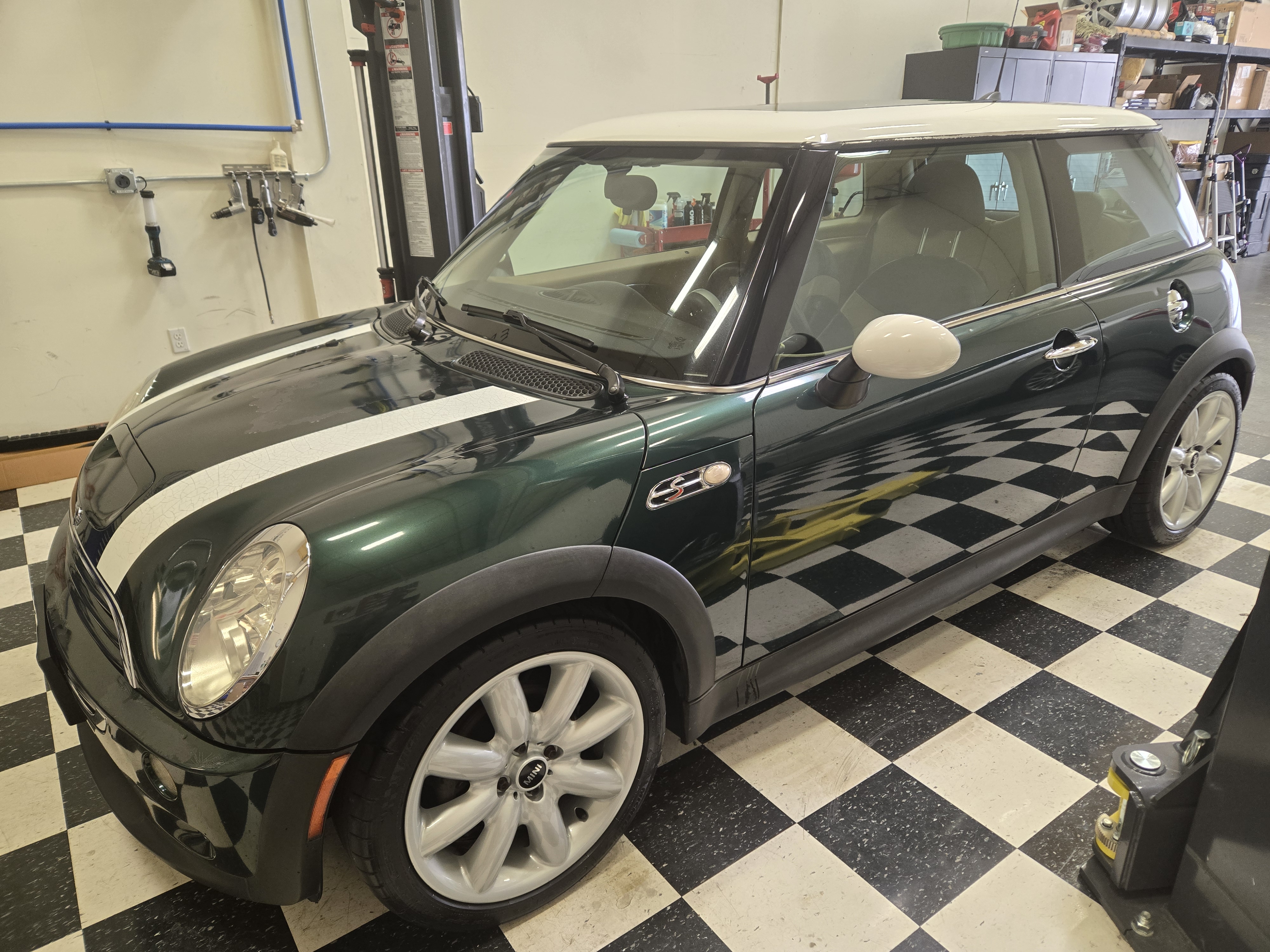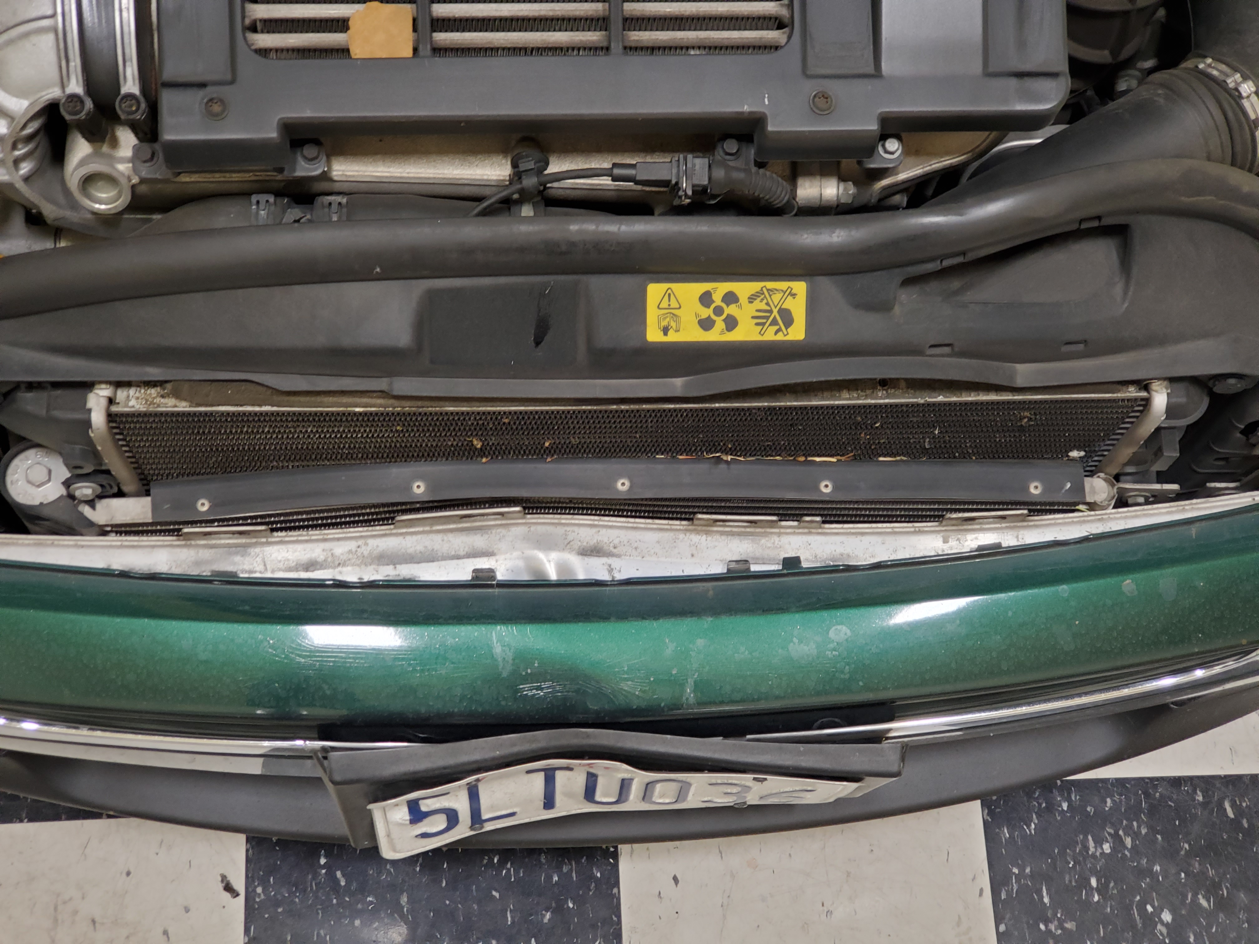 Services Performed: Front End Accident Repair. Involved in freeway stop & roll accident, tagged the back of a Porsche 911 (the Mini won). Damaged license plate frame, cracked paint on bumper cover, bent impact beam which slightly bent A/C radiator (still works) and pushed it into main radiator (still works). Cracked plastic frame that holds radiator to car (servicable). Purchased a used bumper beam from auto recycler (Volvo, Saab, BMW, Mini Recycling in Rancho Cordova). Purchased new license plate mount. Reassembled. All the shunt lines are still good as new. Beam did its job. Only residual sign of damage is the cracked paint on bumper cover (minor) and bends in radiators. All fine for now.