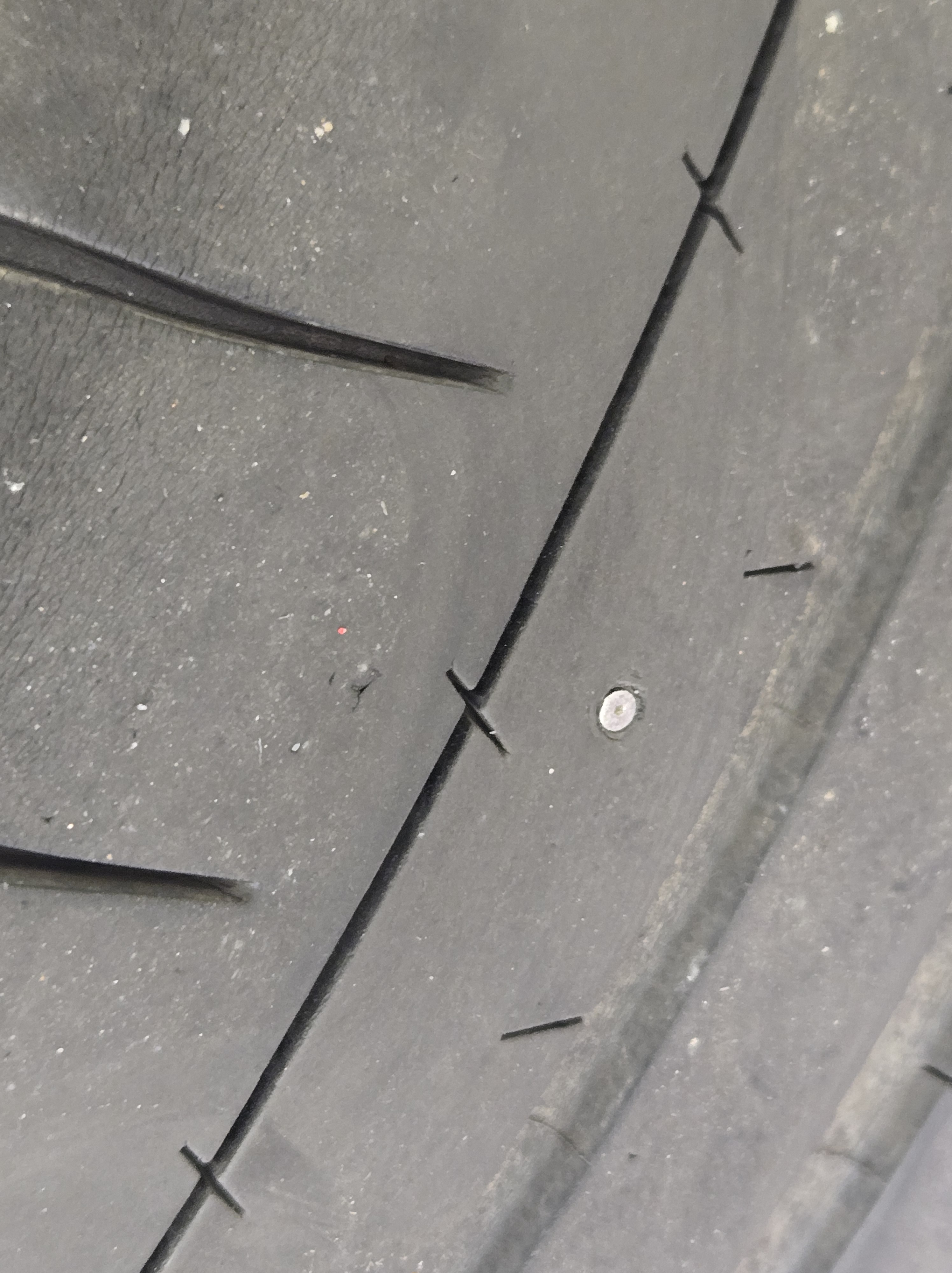 - TPMS warning light was on. Found a nail in the RR tire. Took to local Les Schwab for a patch. Strangely the nail stub was still in the tire on return, so removed it. Not sure it was even punctured. Reset tire pressures to 38 psi and pressed the TPMS calibrate button on center console to reset.