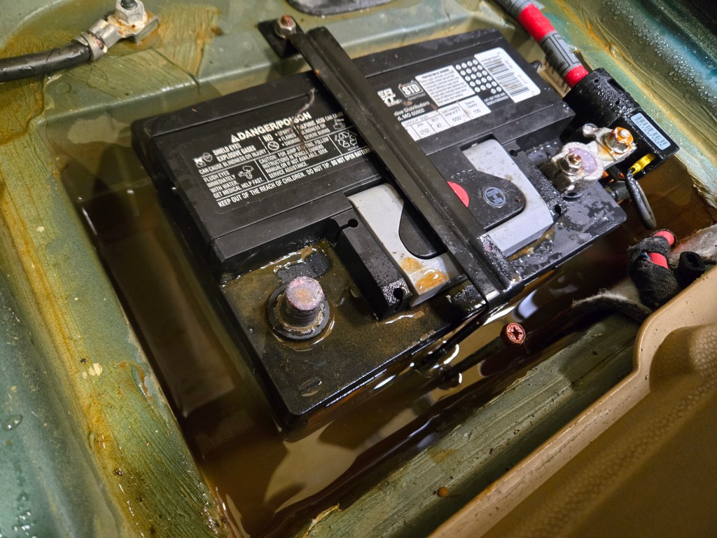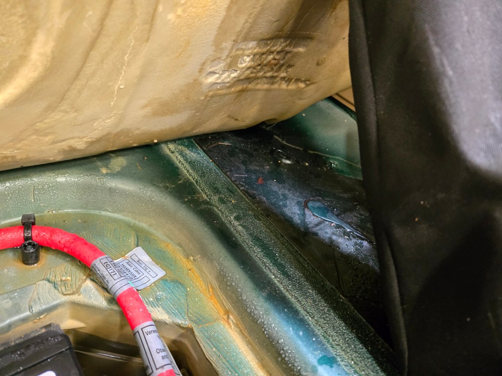 Services Performed: Stefano noticed condensation on the inside windows during cold mornings. Investigated, and the carpets were dry. But, found the rear battery box in the cargo area full of water nearly to the top of the battery. Uh-oh.