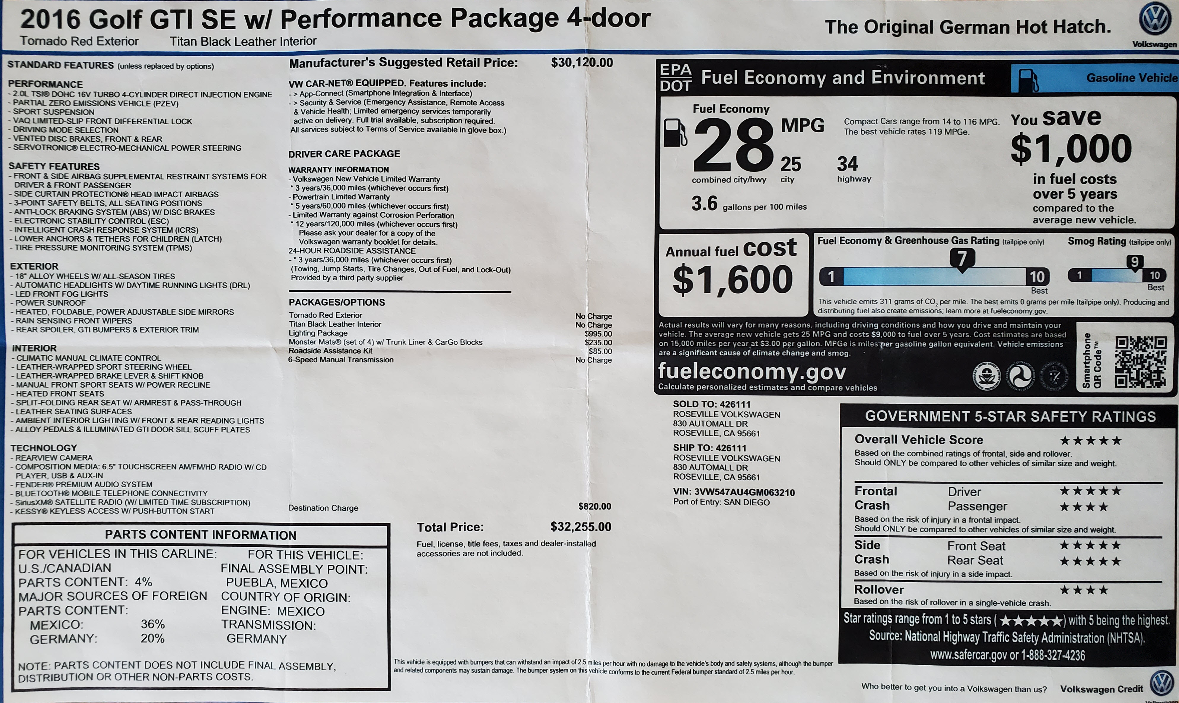 - VIN – 3VW547AU4GM063210 (VIN Decoder here)