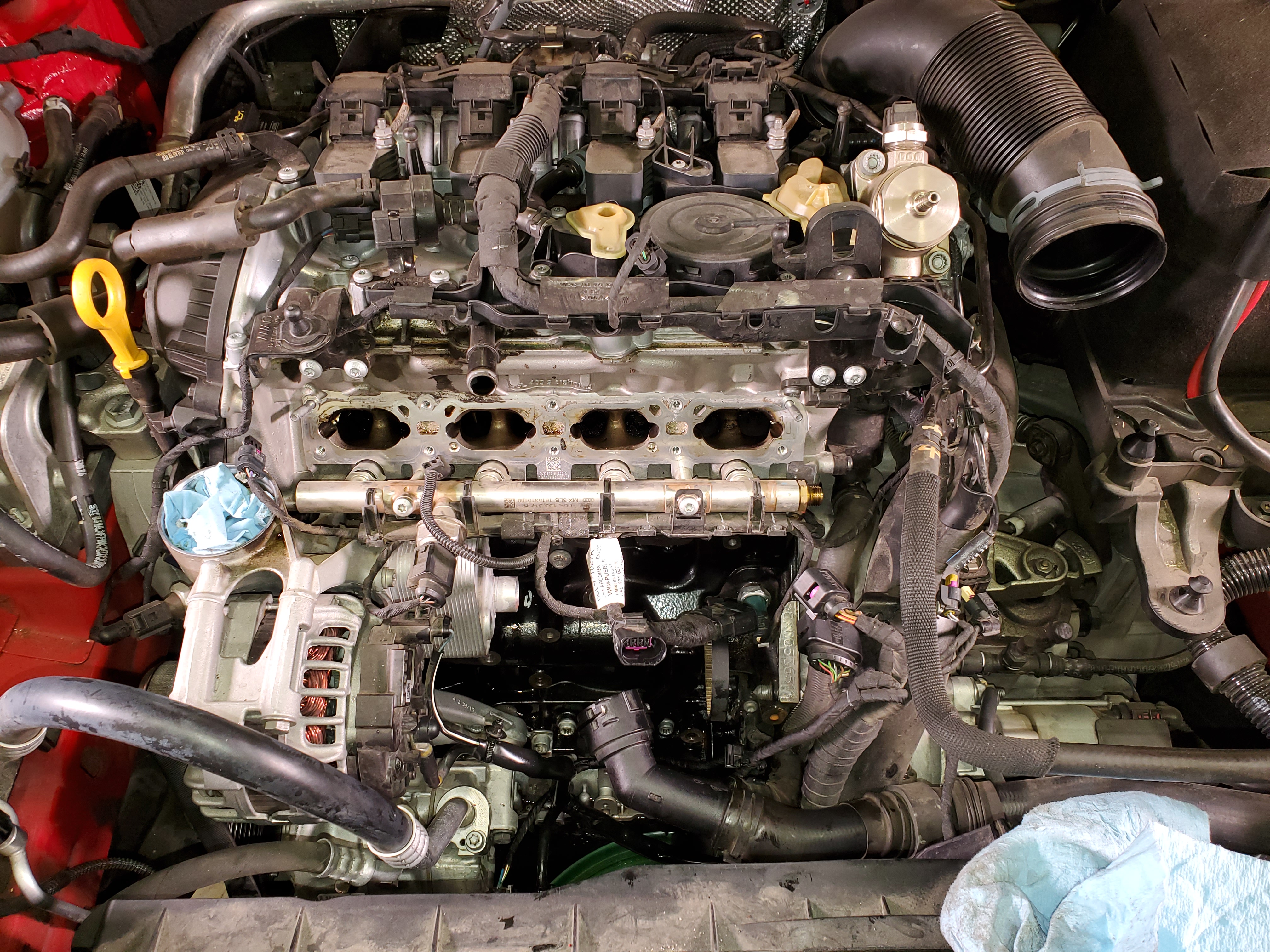 Ordered a new OEM Thermostat Housing (rev M), OEM water pump, OEM union pipe, and OEM intake manifold gasket from ShopDAP.com (one of their kits). Followed the best of steps in the two how to YouTube video’s linked over on the VW Knowledge page. Took the time to really cleanup all the drips and stains of the old fluid on the side of the engine block and hoses, etc. During disassembly discovered on of the lower wiring harness mounting bracket bolts was just finger installed, massively loose. Also discovered that the water pump drive belt cover that is held on with 2 bolts that also act as water pump mounting bolts, the hardest to reach/invisible one was barely tightened. I suspect the dealer monkey didn’t tighten this properly when it was warranty replaced at 2.5 year mark, and this may have been the long term source of the leak.