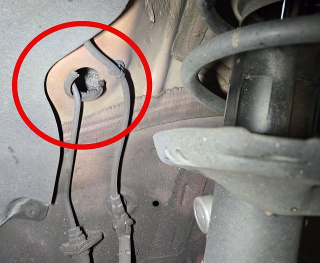 - Noted that the plastic bung in the wheel well where the hard brake line comes through has failed and is falling apart (both left and right sides). Recommend replacing next time doing a brake job and fluid flush. Will need to disconnect the hard line to fit the replacement bung.
