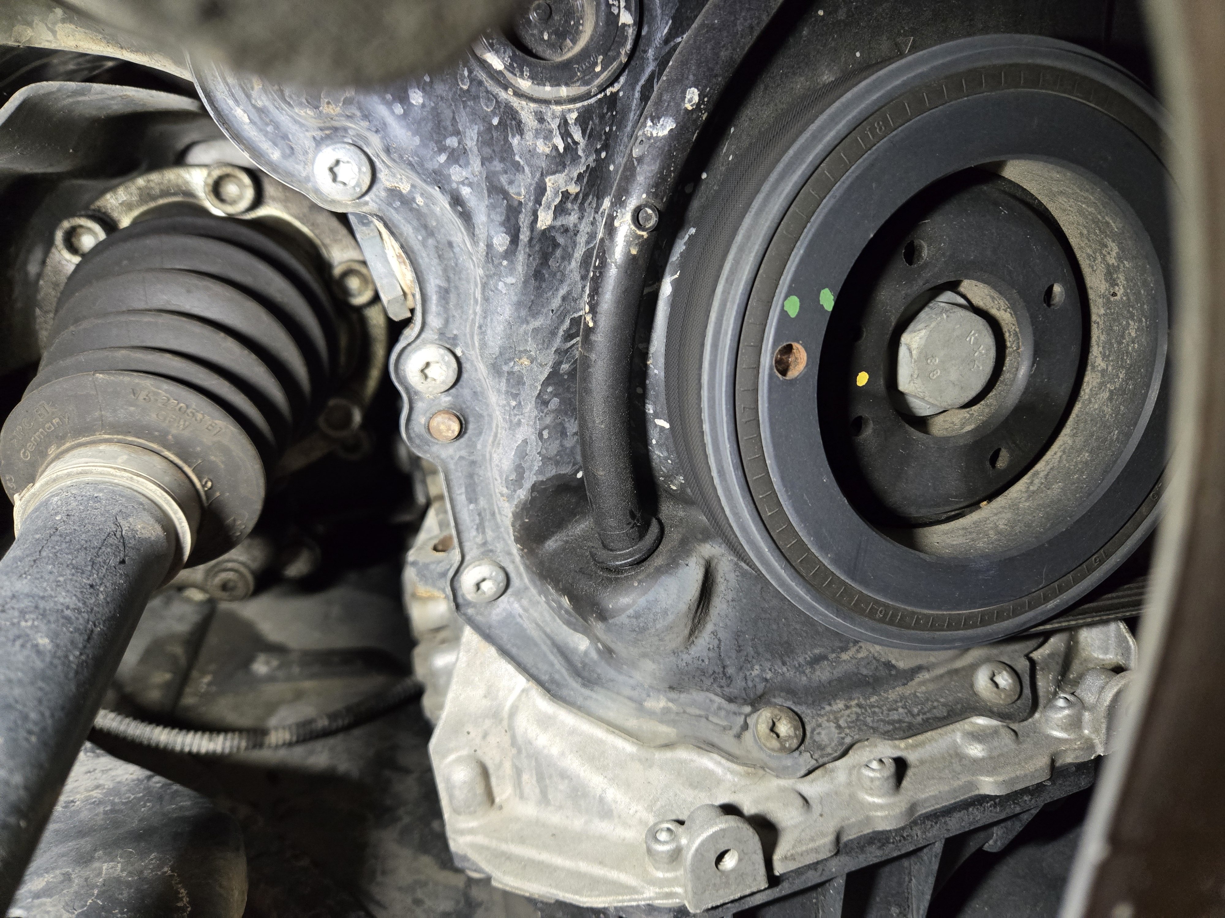 - Research the front ‘Bevel Box’ (differential/transfer case) oil leak. First blush appears to be a common defect where the bolts stretch, release pressure on case halves, and oil weeps up the bolt holes. Some talk of replacing the bolts with ARP performance bolts that don’t stretch and retorquing. VW just says replace whole unit if it leaks ($1,300+). Arrow in photo is pointing at the drain plug (torque to 19Nm). Plan will be to remove one bolt and measure, then order ARP bolts.