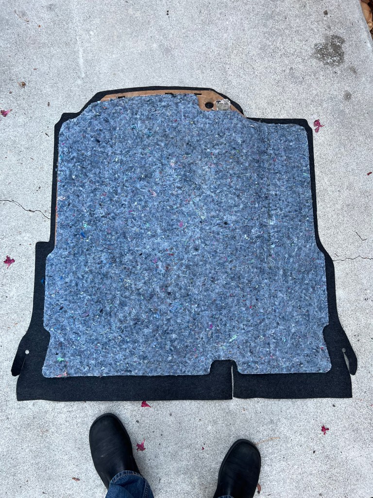 - 1/4 Particle Board replaced with used black painted one, sized to match, reused fabric and sound deadening fabric.
