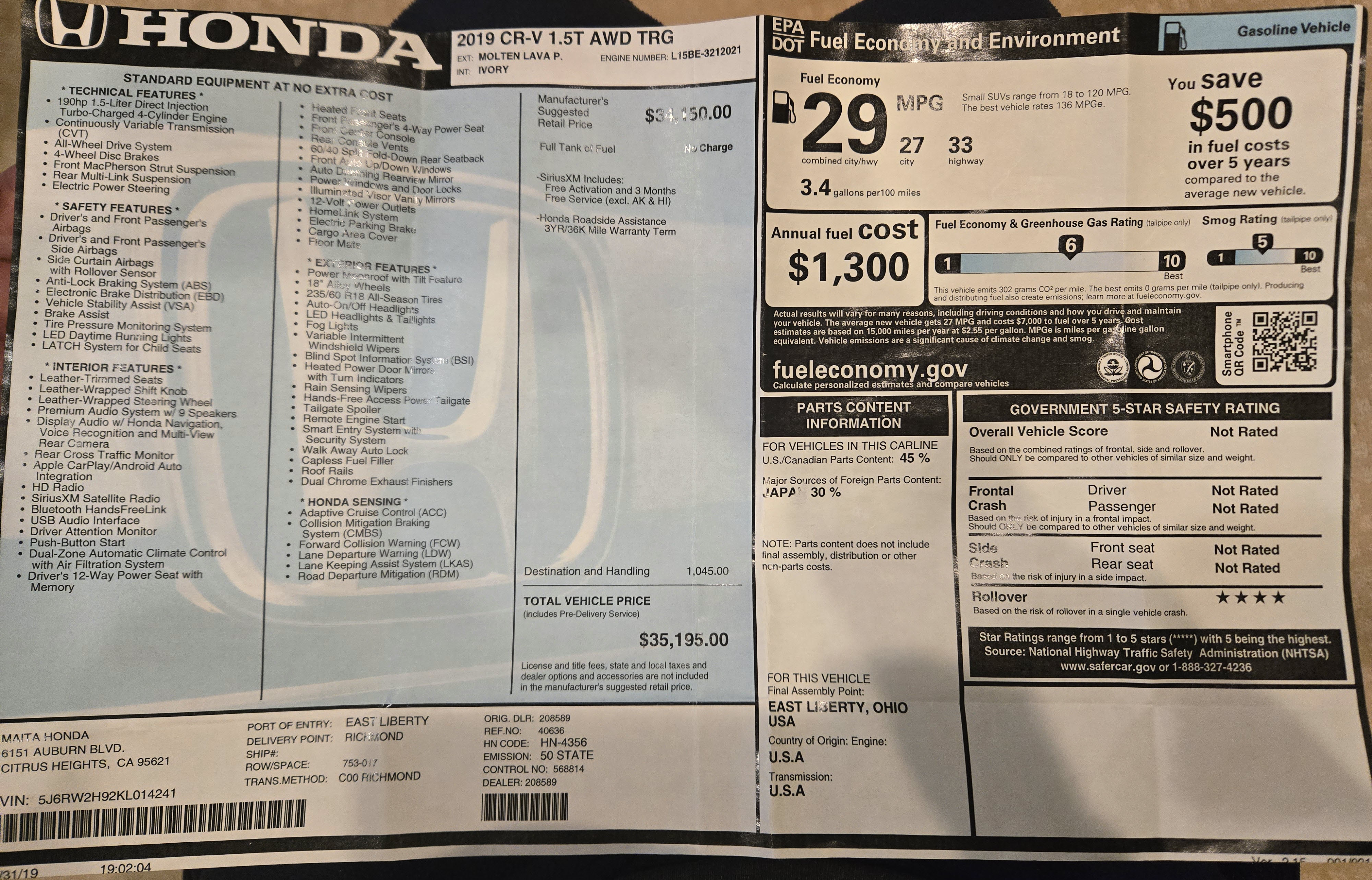- VIN – 5J6RW2H92KL014241 (VIN Decoder here)