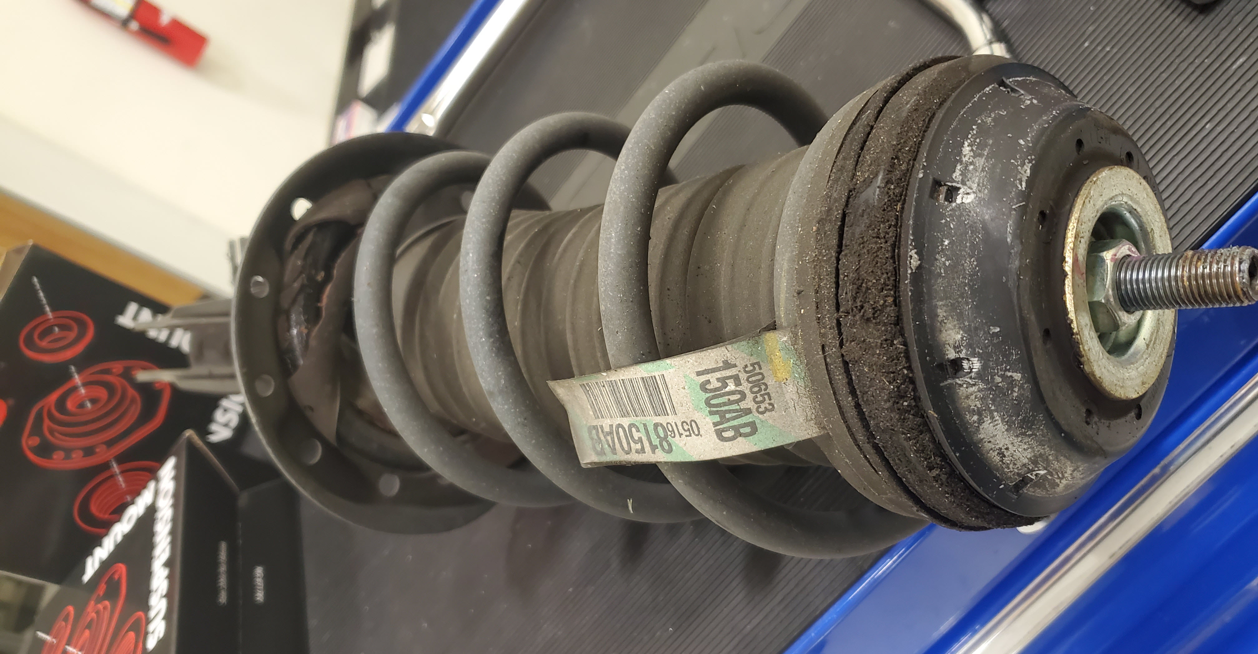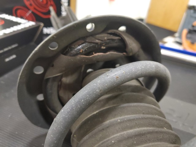 - LF lower spring saddle rubber isolator is twisted out of position around the lower spring bar. During the top mount replacement last fall it was found to be damaged, but not doing much so made the best of it and left as-is. Continue to monitor.